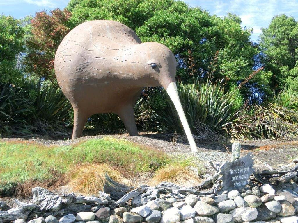 Wir besuchten einen Ort, an dem ein riesiger Kiwi zu bestaunen war. Zufälligerweise war der Erbauer anwesend und berichtete uns voller Stolz, wie er den Kiwi erdacht und gebaut hat. Ein Grundgerüst aus Holz wurde mit Plastefolie umwickelt. Dann folgte ein feinmaschiges Drahtgeflecht zum Auftragen des Betonputzes. Lustig war dann zu erfahren, wie er seine Frau ins Innere des Kiwi bat, um mit Kabelbindern die Folie mit dem Drahtgeflecht zu verbinden. Die arme Frau mußte 5.000 Kabelbinder in dieser Plastehülle bei ordentlicher Wärme und Feuchtigkeit durchstehen. Für die Frau sicher ein Knochenjob, für Ihn und für uns amüsant.