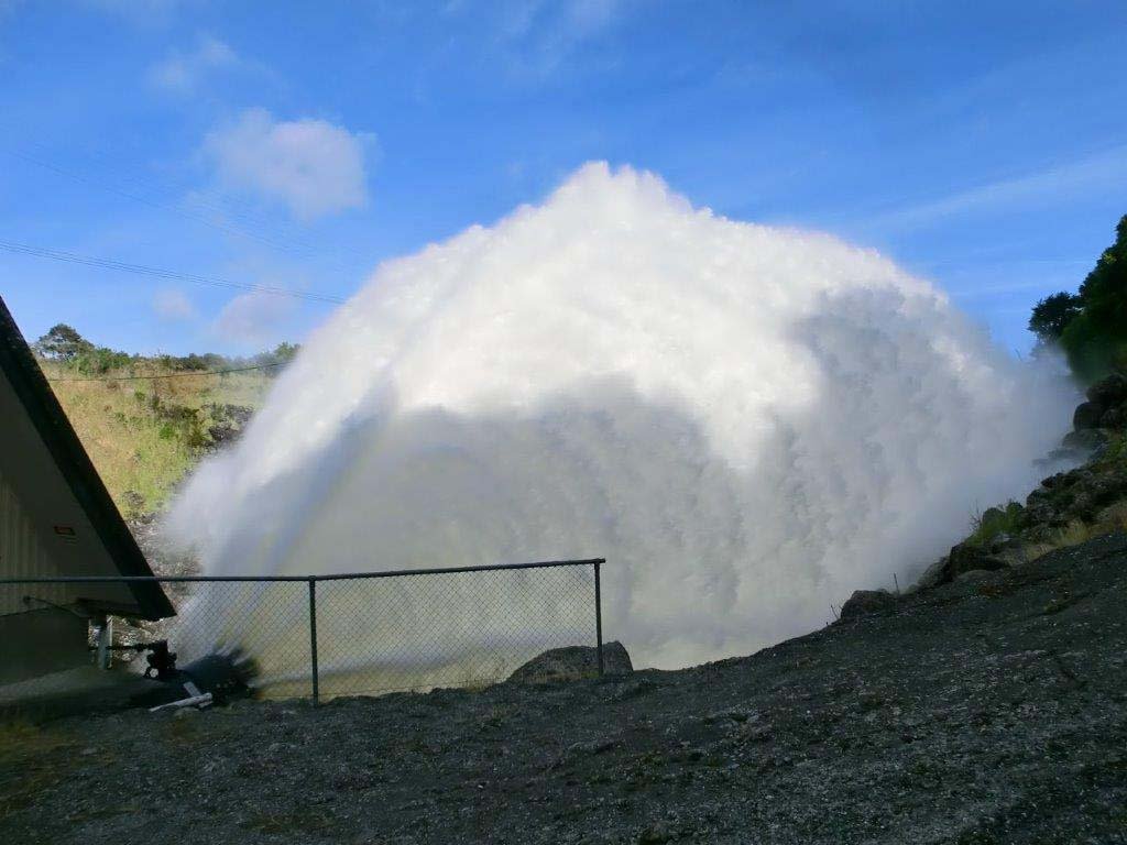 Ebenso viel Zeit verbrachten wir am Wasserkraftwerk dieses Ortes. Hier strömte das Wasser aus einem See durch eine Turbine im Tal. In einer riesigen Fontäne schießt hier das Wasser mit überwältigender Energie aus dem Maschinenhäuschen in den Fluß. Auch die Geräuschkulisse zwingt hier schon zu respektvollem Abstand.