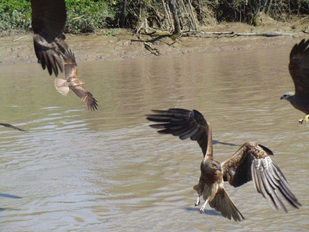 Eine sehr überraschende Aktion war die Schiffsreise mit Fütterung der Krokodile im Fluss. Diese kräftigen Tiere springen tatsächlich fast aus dem Wasser. Im Schlamm sahen wir auch den „Platzhirsch“ mit über 6 m Länge. Diesen Wesen aus der Urzeit möchte man wirklich nicht zu nahekommen. Zum Schluss wurden noch völlig überraschend die Greifvögel gefüttert, die Ihre Nahrung geschickt im Flug fangen oder von der Wasseroberfläche greifen. Die große Menge der plötzlich um uns kreisenden Vögel machte das Erlebnis perfekt.