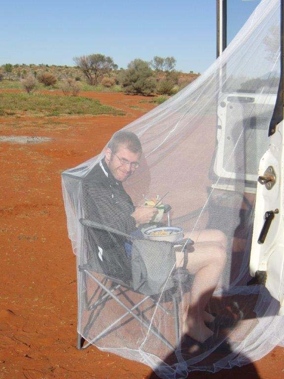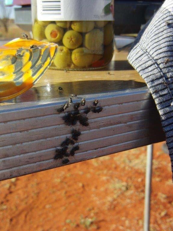 Im Gebiet um den Uluru waren die Fliegen unerträglich. Die sind derart aufdringlich, dass wir uns zum Frühstück entschieden zur Wehr setzen mußten.